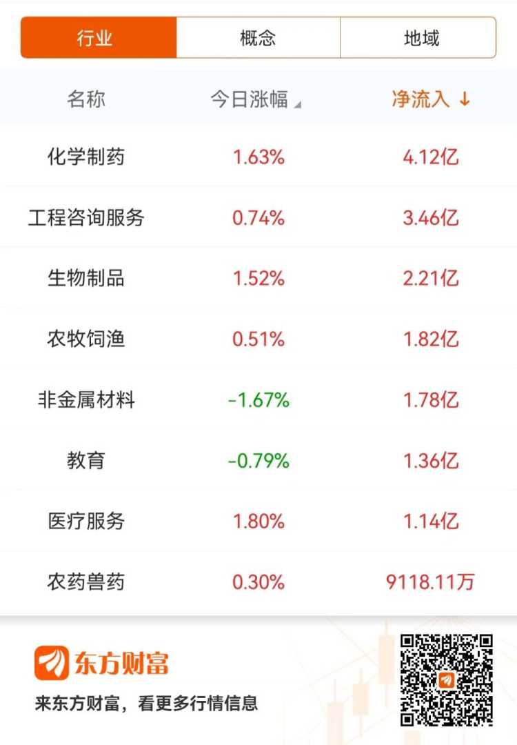 今日,主力资金在部分板块上积极抢筹。具体来看,化学制药板块和工程咨询板块获得了主力的净流入,其中化学制药板块的主力净流入额高达4.12亿元,显示出市场对该板块未来走势的看好。