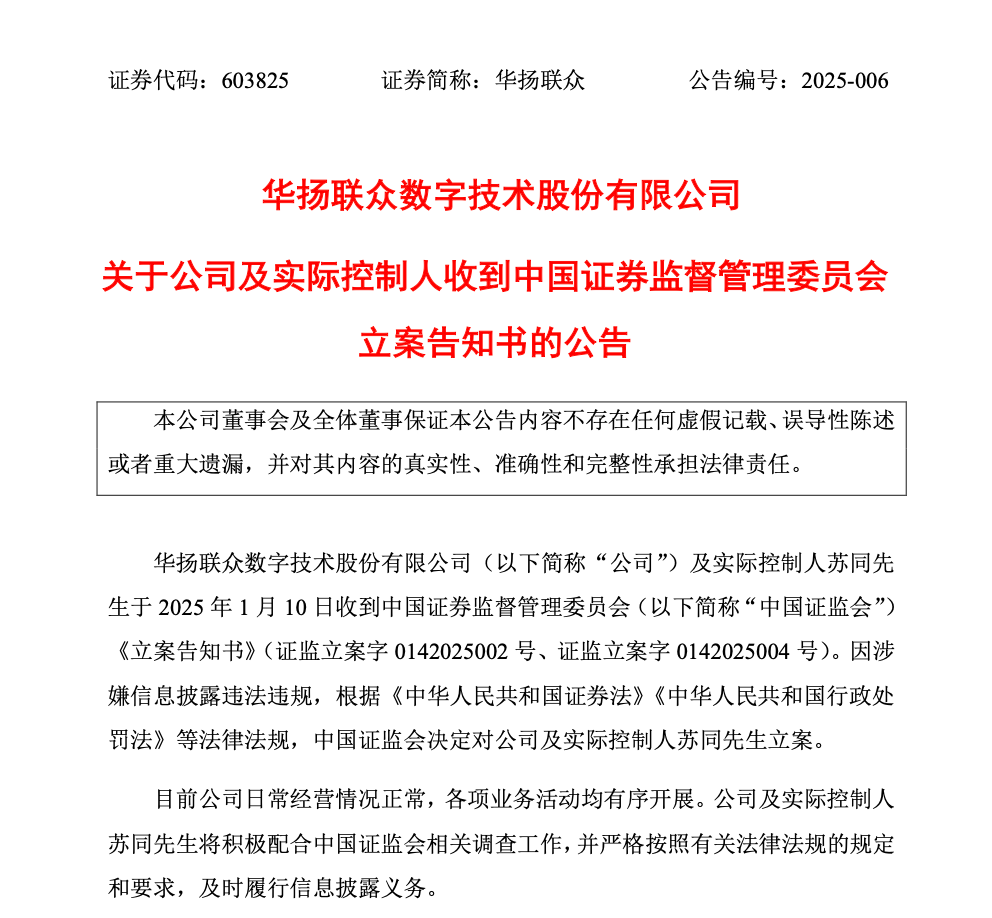 【导读】华扬联众及其实际控制人苏同因涉嫌信息披露违法违规被证监会立案。