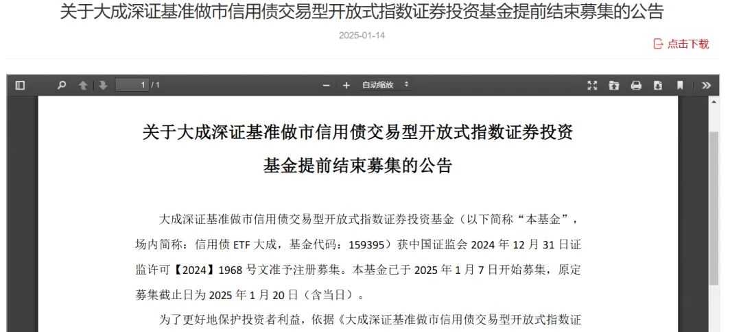 在债券市场近期面临调整的背景下,基准做市信用债ETF却以其独特的魅力赢得了市场的青睐。以大成基金为例,该公司在1月14日发布公告称,其旗下的基准做市信用债ETF已提前完成募集,决定将募集截止日提前至2025年1月13日,并从2025年1月14日起停止接受认购申请,正式结束此次发售。