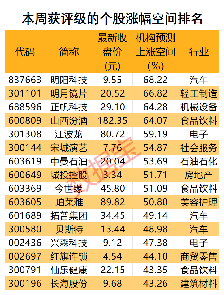 本周,江铃汽车、汉钟精机、永信至诚3股获得券商机构上调评级。其中,江铃汽车与文远知行合作的无人驾驶货运车已进入商业化运营试点状态,国元证券因此将其评级上调至“买入”。据数据宝统计,本周获2家及以上机构评级的个股中,16股最新收盘价较机构一致预测目标价上涨空间超40%,拓普集团、明阳科技等个股上涨空间尤为显著。