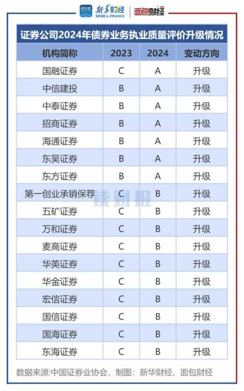值得注意的是,本次考评中有17家证券公司的评级实现了显著提升。其中,国融证券表现尤为抢眼,其评级从上一年的C类连升两级至A类;中信建投、中泰证券等6家公司则从B类晋升为A类;东海证券、国海证券等10家公司则从C类升级至B类。此外,中金公司、财信证券等7家公司更是连续三年稳居A类评级,彰显了其在债券业务领域的深厚底蕴与卓越实力。