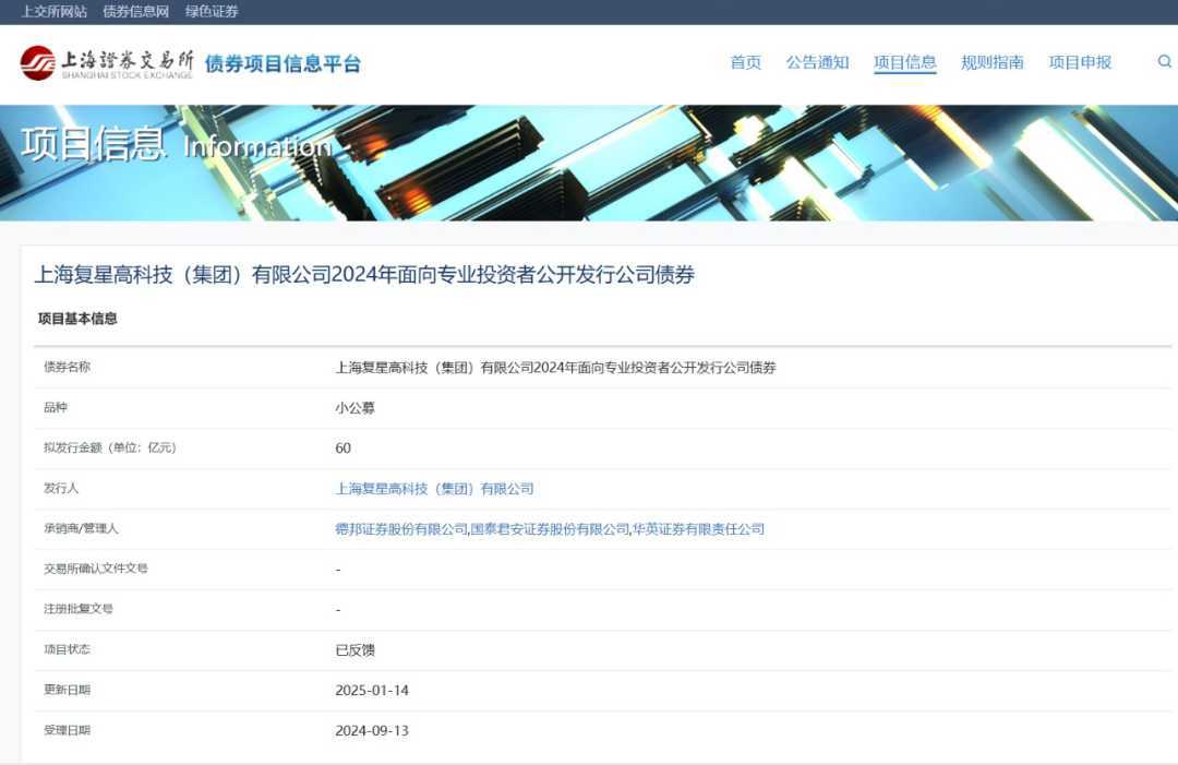 上海复星高科技集团60亿小公募债券项目获上交所反馈