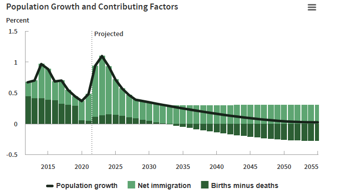 CBO的人口展望基于各种政府来源的数据,反映了截至去年11月15日实施的法律和政策情况。生育率的持续下滑是人口负增长的关键因素之一。CBO指出,如果没有移民,美国人口将从2033年开始减少,部分原因是生育率预计将保持在较低水平,不足以维持世代更替。尽管CBO曾预计生育率将稳定在1.7,但2023年的实际生育率仅略高于1.6,迫使CBO将长期生育率预期也下调至这一水平。