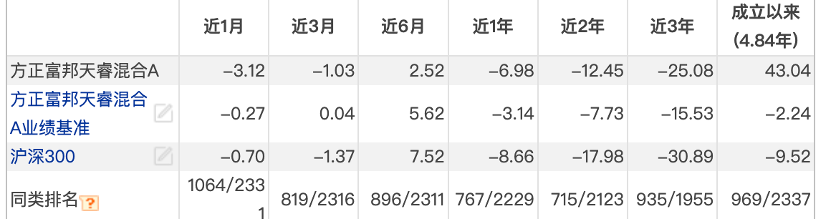 而他接手的方正富邦天睿灵活配置,近三个月和近六个月的回报率也均跑输业绩比较基准,处于同类产品中的中游水平。