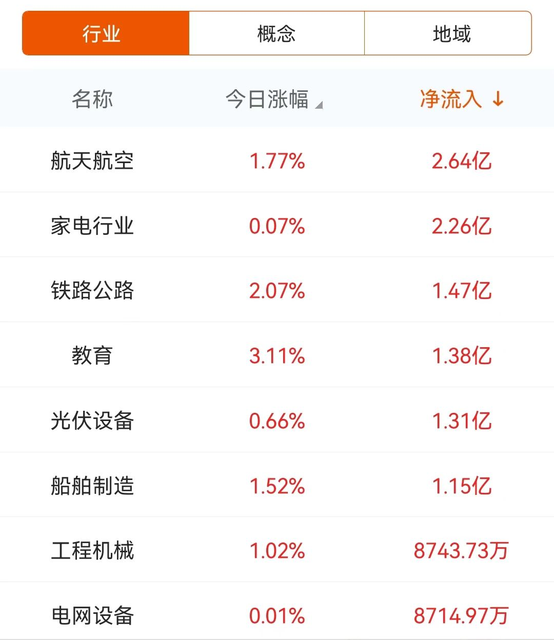 从资金流向来看,航空航天和家电等板块成为今日市场主力资金的抢筹对象,其中航空航天板块更是净流入2.64亿元。