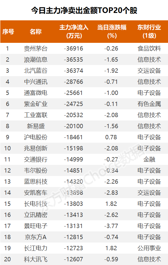同样据东方财富Choice数据显示,7月18日主力净卖出前20大个股中,贵州茅台以3.69亿元的净卖出额位居榜首;浪潮信息紧随其后,主力净卖出3.65亿元。
