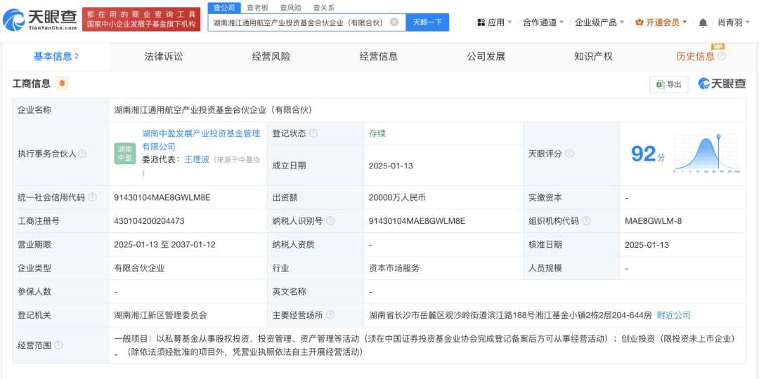 湖南湘江通用航空产业投资基金合伙企业(有限合伙)近日成立,出资额2亿人民币,旨在依托湖南湘江新区科创优势和航空航天北斗产业链基础,聚焦低空经济、航空航天北斗等产业链硬科技领域进行投资。