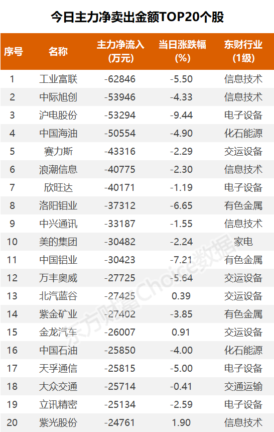 同样根据东方财富Choice数据,7月17日,主力净卖出前20大个股中,工业富联以6.28亿元的主力净卖出额位居第一;中际旭创排名第二,主力净卖出5.39亿元。此外,北汽蓝谷排名第十三,主力净卖出2.74亿元。