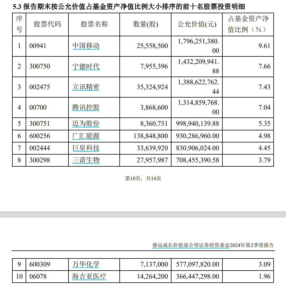 图片来源:睿远均衡价值三年持有混合2024年二季报