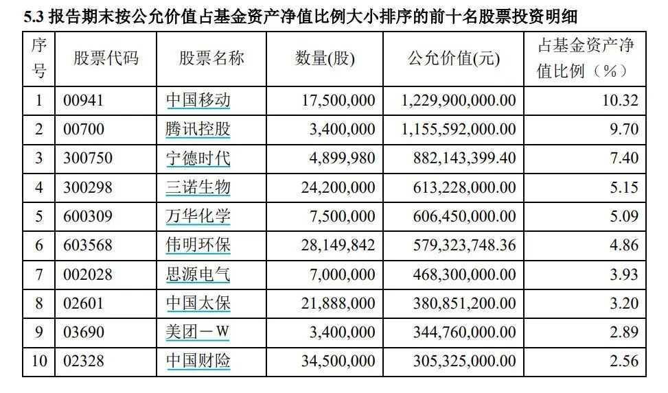 在持仓方面,该基金增持了宁德时代、三诺生物、万华化学、伟明环保、中国财险,减持了中国移动、思源电气、美团-W,而腾讯控股的持仓数量保持不变,新进的中国太保则成为前十大重仓股之一。