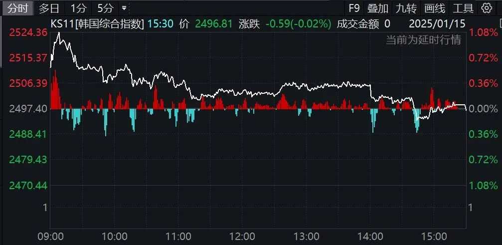 与此同时,日本股市方面,日经225指数收盘下跌0.08%,报收于38444点。韩国股市则呈现出高开低走的态势,早盘一度上涨超过1%,但全天收盘时韩国综合指数微跌0.02%。