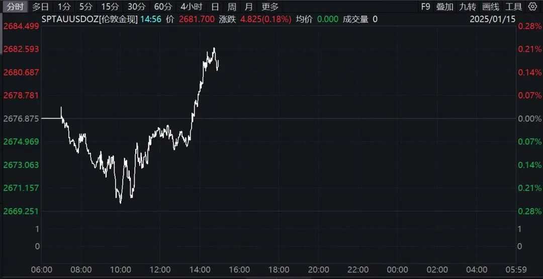 在国际贵金属市场方面,现货黄金价格出现了显著的拉升行情。盘中,黄金价格一度向上触及2680美元/盎司的高位,日内涨幅一度超过0.2%。这一表现显示出投资者对于避险资产的强烈需求。