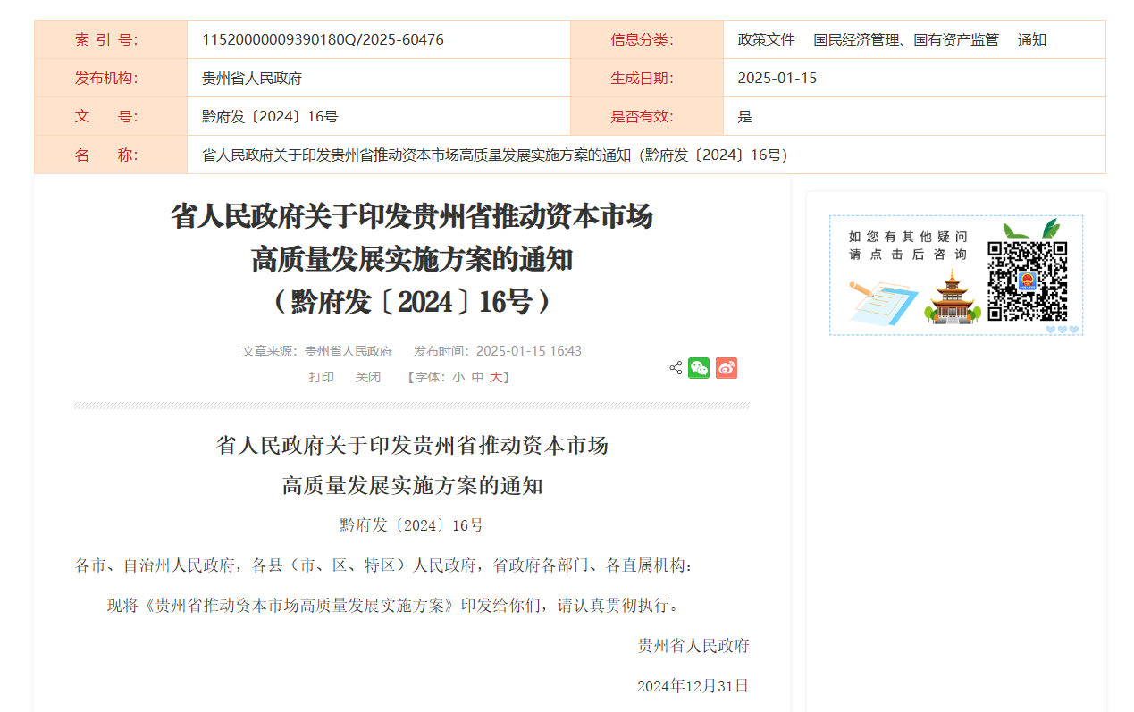 据贵州市人民政府网站1月15日消息,贵州省人民政府近日正式发布了《关于印发贵州省推动资本市场高质量发展实施方案的通知》,该通知详细列出了32项旨在促进资本市场高质量发展的具体举措。