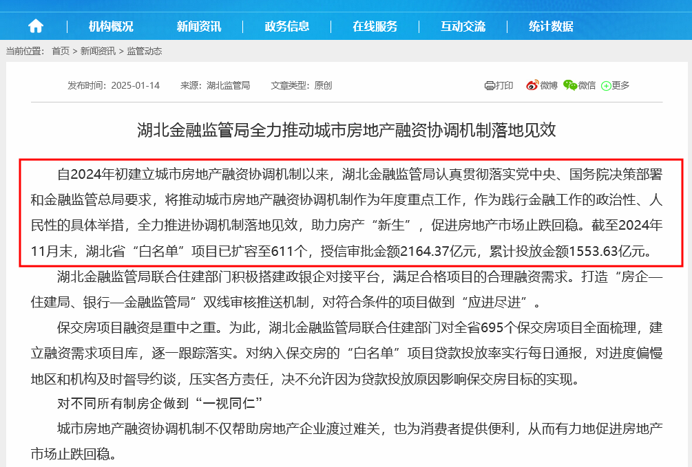 此外,截至2024年11月末,湖北省民营房企“白名单”项目达327个,占比53.26%。其中,民营房企项目167个,占审核制项目的54.58%。湖北金融监管局局长庞雪峰表示,下一步将持续巩固和扩大城市房地产融资协调机制的工作成效,并继续推动“白名单”项目的扩展与增效。