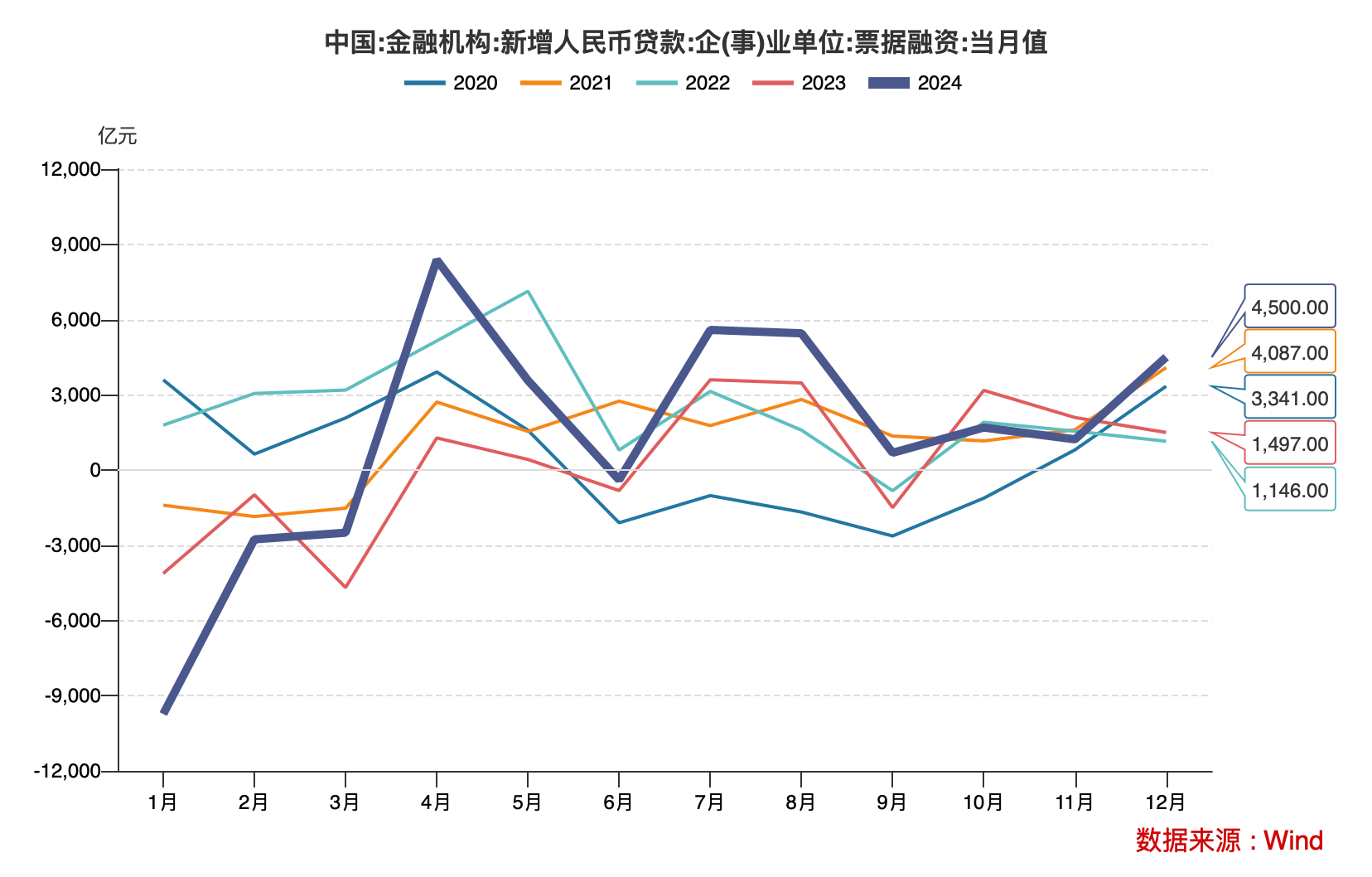 Wind数据显示,2020年至2023年12月的票据融资规模分别为3341亿元、4087亿元、1146亿元和1497亿元,相比之下,2024年12月的票据融资规模达到了前所未有的高度。