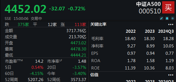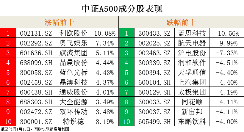 1月15日,中国A股市场经历全天震荡调整,创业板指表现疲弱,领跌大盘。沪深两市当日成交额为1.19万亿元人民币,与前一交易日相比减少了1619亿元。中证A500指数(代码:000510.SH)收盘下跌0.72%,报收于4452.02点。在该指数的成分股中,有375家公司股价下跌。
