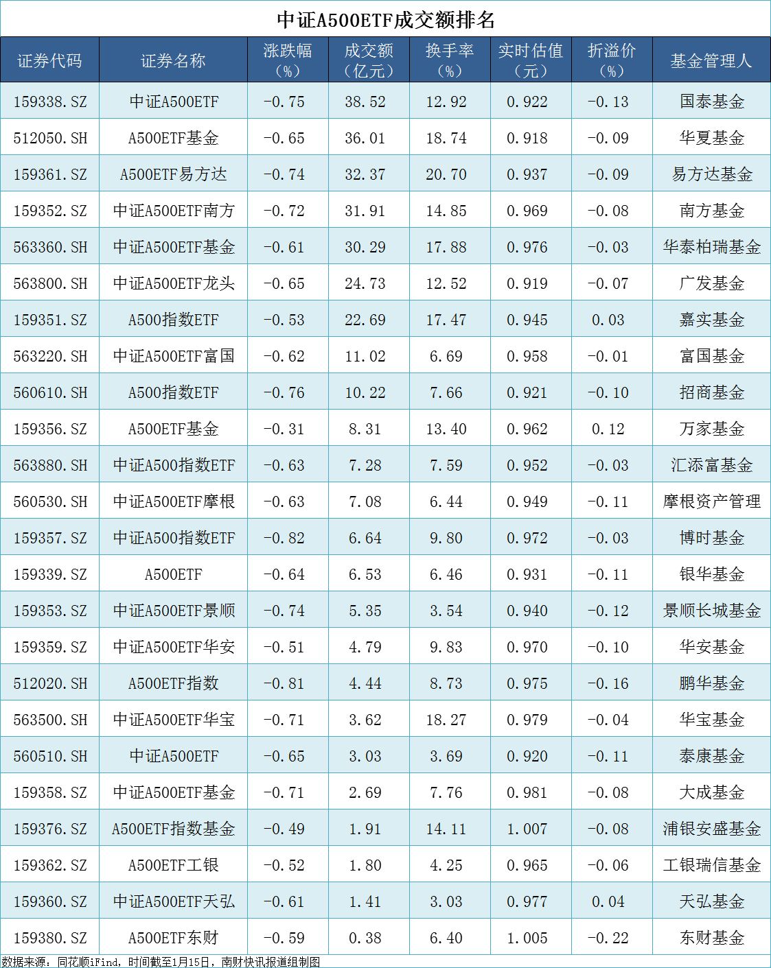1月15日,中国A股市场全天震荡调整,创业板指领跌。中证A500指数收跌0.72%,24只中证A500ETF集体收跌,成交额较前一交易日减少。换手率方面,易方达基金位居第一。实时估值方面,仅有2只中证A500ETF在1元以上。