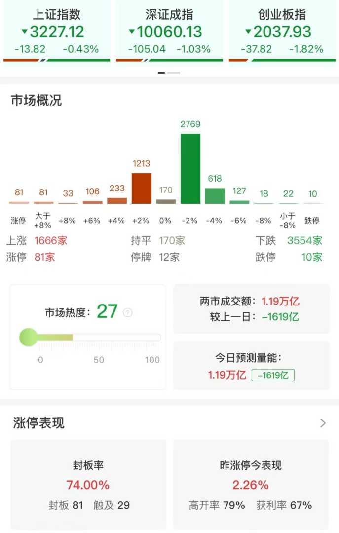 财联社1月15日电,今日市场全天呈现震荡调整态势,创业板指表现尤为疲弱,领跌两市。沪深两市全天成交额为1.19万亿元,与上个交易日相比减少了1619亿元,显示出市场交投活跃度有所下降。盘面上,热点板块较为分散,缺乏明确的主线,个股方面则是跌多涨少,全市场有超过3500只个股下跌,市场情绪较为谨慎。