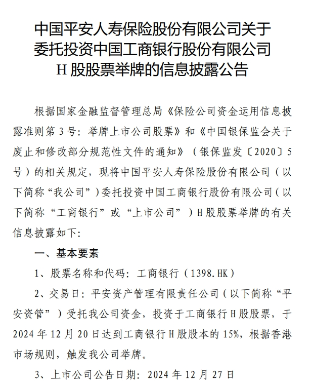 据公告,截至2024年12月20日,平安人寿持有的工商银行H股股票账面余额高达583.21亿元,占其上一季度末总资产的1.26%。