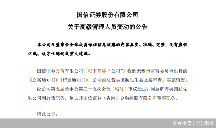 国信证券副总裁吴国舫因涉嫌严重违纪违法被立案审查并实施留置措施,公司已解聘其副总裁职务并免去其在香港公司的董事职位。