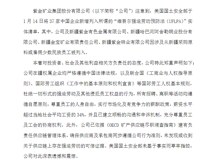 在消息层面,紫金矿业发布公告称,公司及部分在新疆的权属企业已被列入美国《外国公司问责法》(UFLPA)实体清单。然而,紫金矿业表示,此次被列入UFLPA实体清单预计不会对公司产生重大影响。