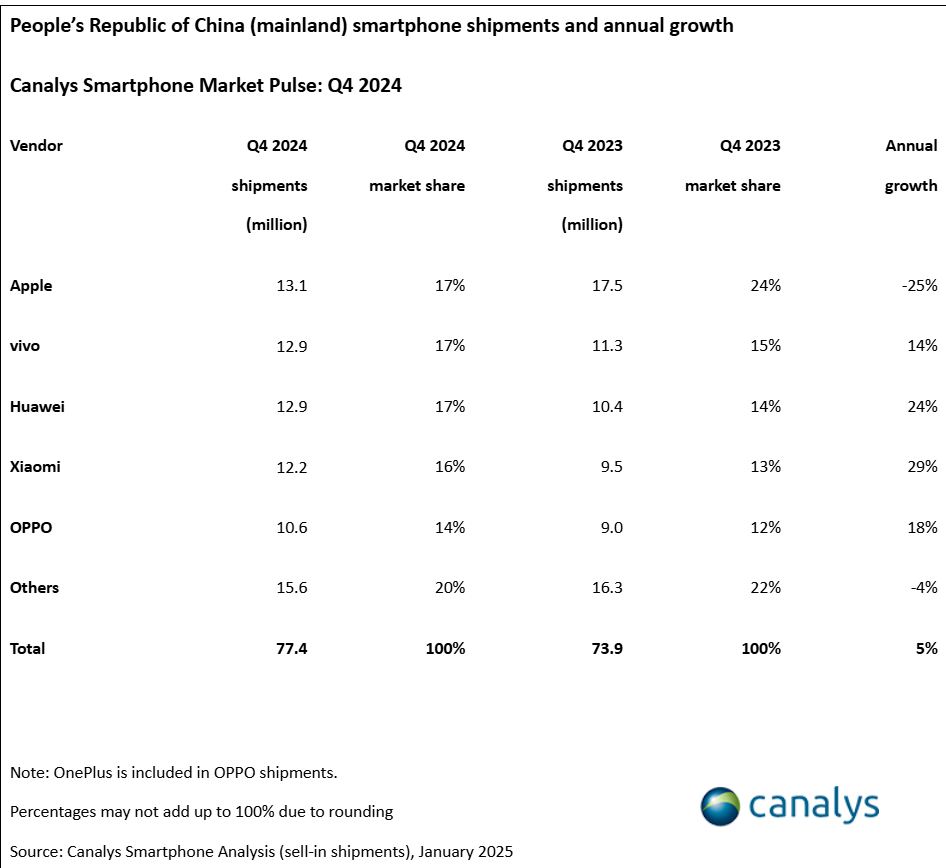 在2024年的第四季度,智能手机市场更是呈现出了积极的增长趋势,出货量达到了7740万台,同比增长5%。然而,值得注意的是,尽管这一季度是苹果的传统销售旺季,但苹果手机的出货量却同比大幅下跌了25%。这一变化主要归因于国内智能手机品牌如华为、小米、OPPO等的强势崛起,这些品牌在该季度的出货量实现了同比大幅增长。