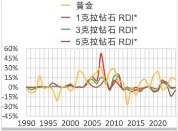 上图展示了1990至2024年间钻石和黄金价格的变化情况(以百分比计算),进一步印证了钻石市场的稳健增长趋势。