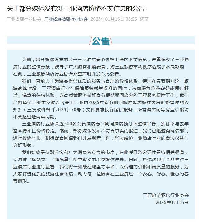 三亚旅游酒店行业协会发布公告,回应近期部分媒体发布的关于三亚酒店春节价格上涨的不实报道,强调协会及其会员单位致力于提供优质服务与合理价格体系,呼吁游客理性看待相关报道。