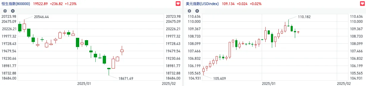 有趣的是,1月13日,美元指数突破110点,创下阶段新高,而恒生指数也同步刷新了调整低点。但随后,随着美元指数的阶段性走弱,港股市场在本周开启了反弹行情。