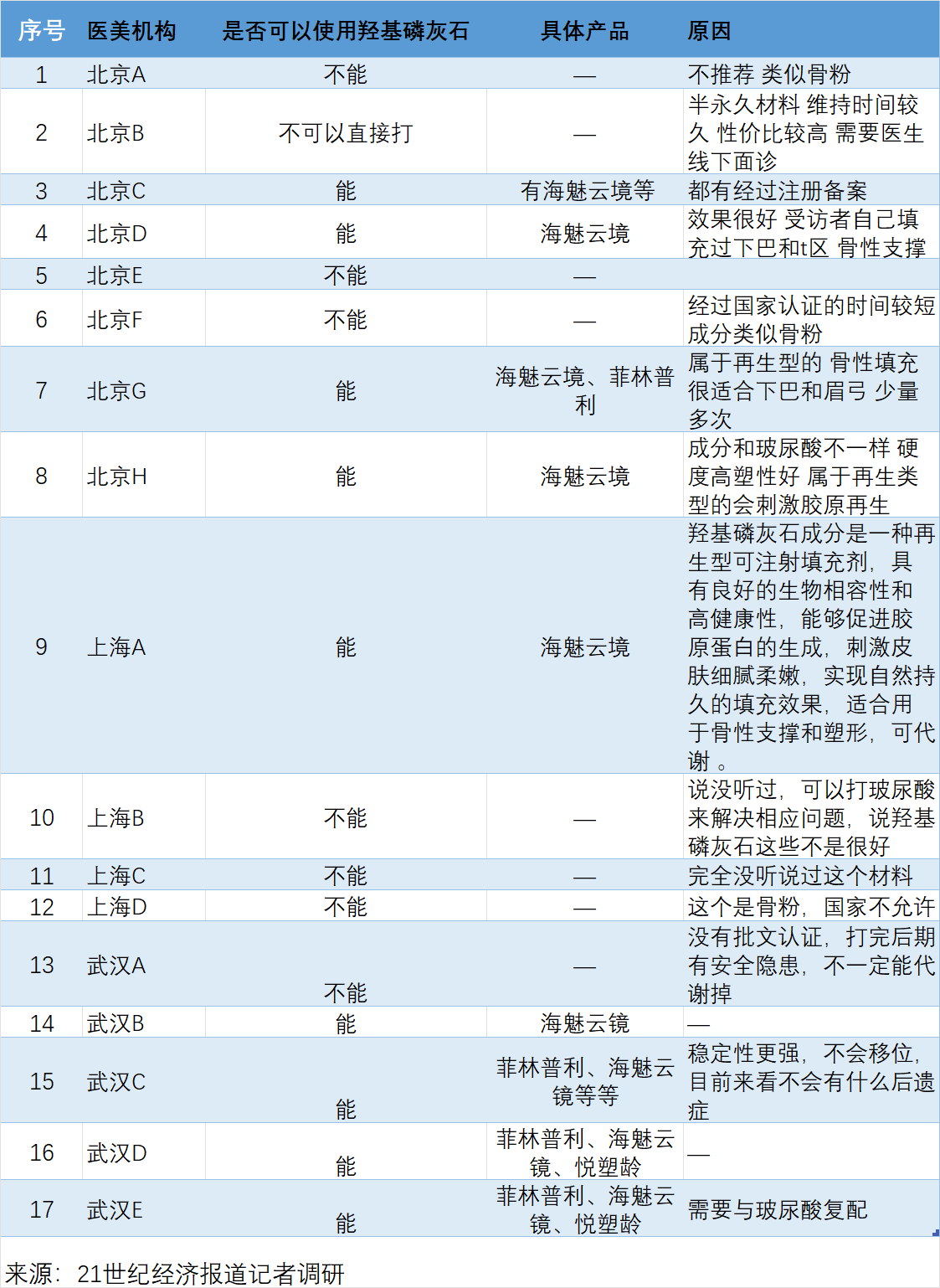 据医美镜方面数据显示,国内已有约200个羟基磷灰石类产品的注册证,但这些产品大多适用于骨科和口腔科,而非医美领域。记者对北京、上海、武汉三地的17家医美机构进行了调研,发现其中7家机构明确表示不注射羟基磷灰石,原因包括成分类似骨粉、国家认证时间短、无注射许可、产品效果不佳等。