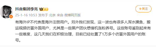 16日,抖音集团副总裁李亮在个人微博上,就抖音上出现的大量海外IP用户现象进行回应,明确指出:“有海外IP不代表是海外注册用户”。他进一步指出,此次现象中,存在大量仿冒外国用户的账号,试图通过搬运视频等手段浑水摸鱼,“尤其是一些黑产团伙,企图借此机会涨粉养号”。这些账号的鉴别存在一定难度,但抖音已采取积极措施进行治理,截至目前,已处置超过1万个仿冒外国用户的账号。