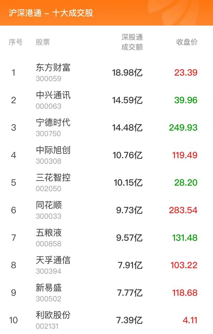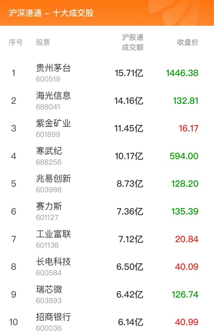 根据交易所公布的沪深港通十大成交股数据,沪股通方面,贵州茅台、海光信息、紫金矿业位居前三甲,其成交额分别为15.71亿元、14.16亿元和11.45亿元;而在深股通方面,东方财富、中兴通讯、宁德时代则领跑市场,成交额分别达到18.98亿元、14.59亿元和14.48亿元。