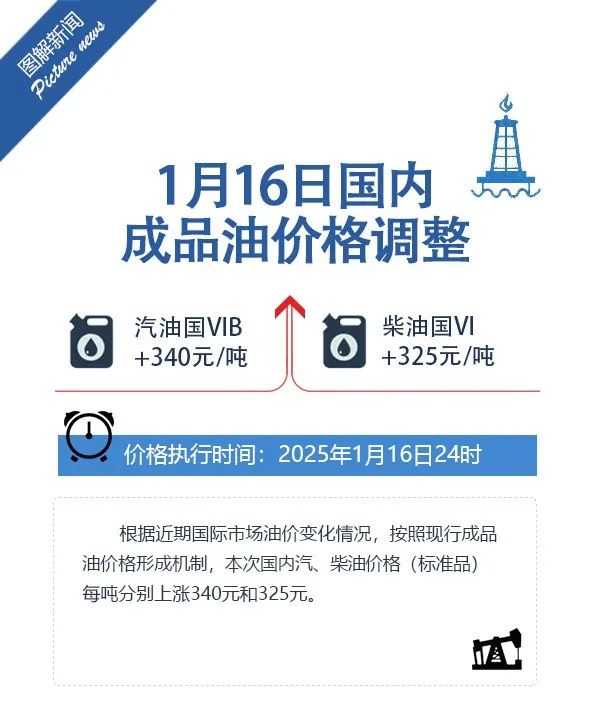 根据国家发展改革委的公告,依据近期国际市场油价的变动情况,并遵循现行的成品油价格形成机制,自2025年1月16日24时起,国内汽油和柴油的最高零售价格(标准品)分别上调340元和325元每吨。调整后的各省(区、市)及中心城市的汽、柴油最高零售价格详见附表。