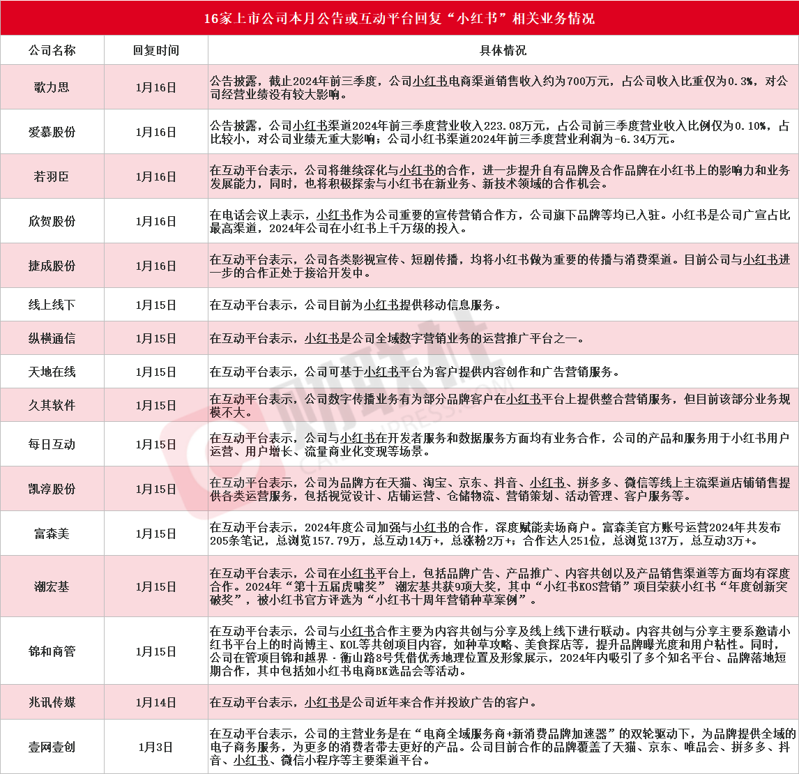 据财联社不完全统计,截至发稿时,已有16家A股上市公司在本月公告或互动平台上回应了与“小红书”相关的业务情况。这些公司包括歌力思、爱慕股份、若羽臣、欣贺股份、捷成股份、线上线下、纵横通信、天地在线、久其软件、每日互动、凯淳股份、富森美、潮宏基、锦和商管、兆讯传媒和壹网壹创等,具体详情见附图。