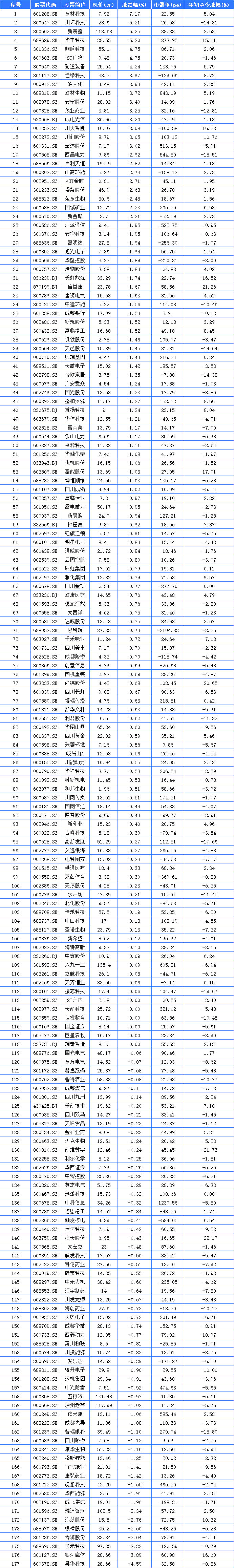 四川A股112家上涨,东材科技领涨
