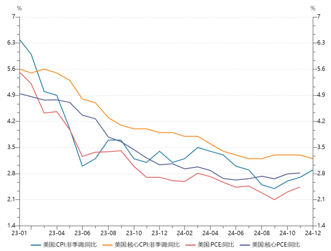 此外,美联储更为关注的另一通胀指标——个人消费支出指数(PCE)也自2024年9月起逐步回升。2024年9月至11月,PCE分别为2.10%、2.31%和2.44%,核心PCE则分别为2.66%、2.79%和2.82%。而2024年12月的PCE数据则将于1月25日正式发布。对于这一即将揭晓的数据,市场普遍持乐观态度。