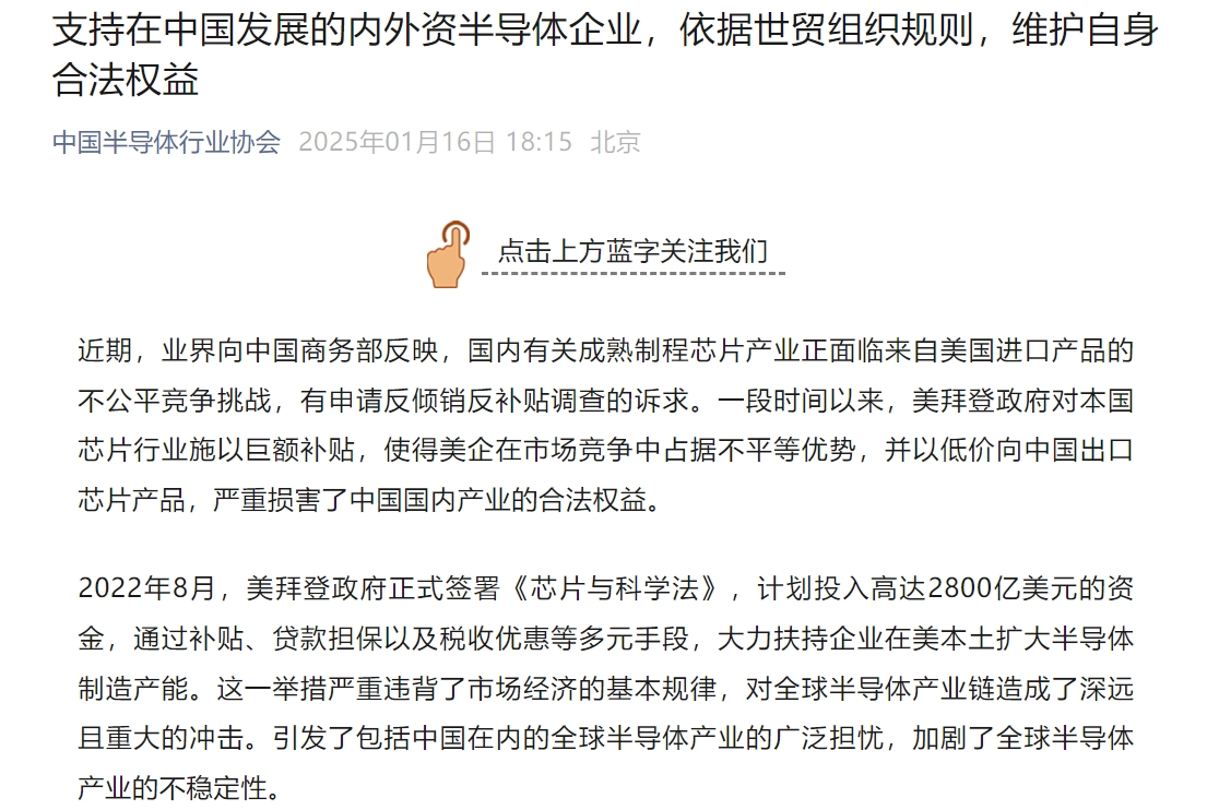 1月16日,中国半导体行业协会通过官方公众号发表声明,明确表态支持在中国发展的内外资半导体企业,鼓励它们依据世贸组织规则,积极维护自身合法权益。同日,中国机电产品进出口商会亦发布声明,对美国拜登政府近期发布的限制中国网联车软硬件及整车最终规则表达了强烈反对。