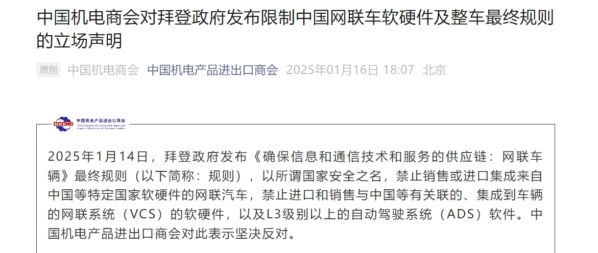 另一方面,中国机电产品进出口商会对拜登政府发布的网联车限制规则表示坚决反对。他们认为,该规则以国家安全之名,禁止销售或进口集成来自中国等特定国家软硬件的网联汽车及相关软硬件,不仅有悖于当前国际合作的大趋势,不利于相关技术的发展与进步,而且严重损害全球汽车产业链供应链安全,损害消费者利益。