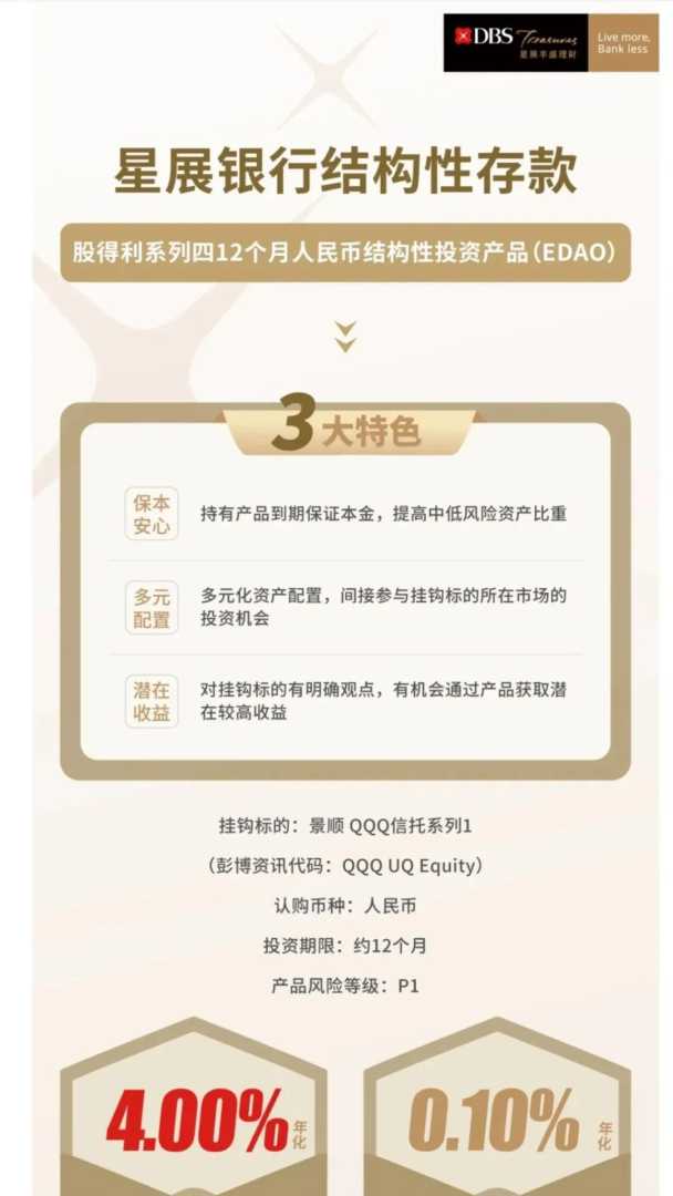 然而,业内人士也提醒投资者,尽管结构性存款名字中带有“存款”二字,但其具有一定的投资属性,通常是由存款加上某种金融衍生品组成。因此,投资者在选择结构性存款产品时,应充分了解产品特性与风险因素,谨慎投资。星展银行的理财经理小静告诉记者,该行目前有一年期人民币结构性存款和美元结构性存款产品,年化收益率分别最高可达4%和4.5%。但投资者在选择时,需根据自身的风险承受能力做出决策。
