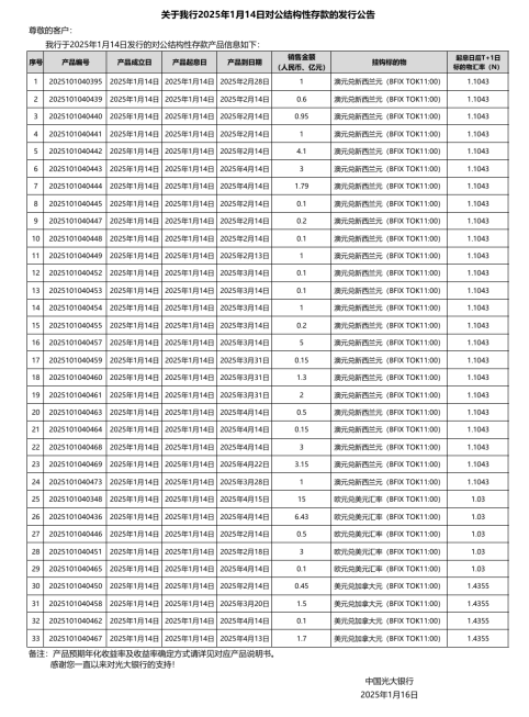 除了个人结构性存款产品外,也有银行大力发行对公结构性存款产品。例如,光大银行官网显示,对于数额大于1000万元的对公资金,客户可选择购买对公结构性存款产品(期限有1个月、3个月、6个月、12个月)。该行在1月14日发行了超过30款对公结构性存款产品。