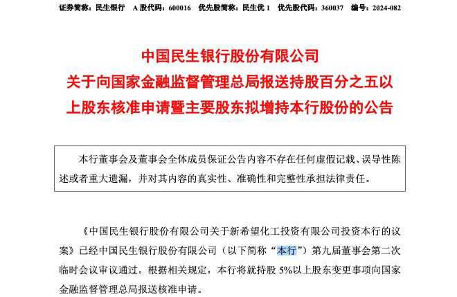 民生银行将迎来新股东,新希望化工拟增持股份超5%