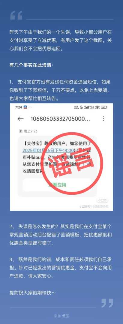 2025年1月17日凌晨,@支付宝官方发布了一份正式声明,针对近期发生的重大技术故障(即所谓的“bug事故”)进行了详细回应。此次故障引发了广大用户的广泛关注与讨论,支付宝方面在声明中表达了对此次事件的深刻歉意,并承诺将采取一系列措施,以防止类似问题的再次发生。
