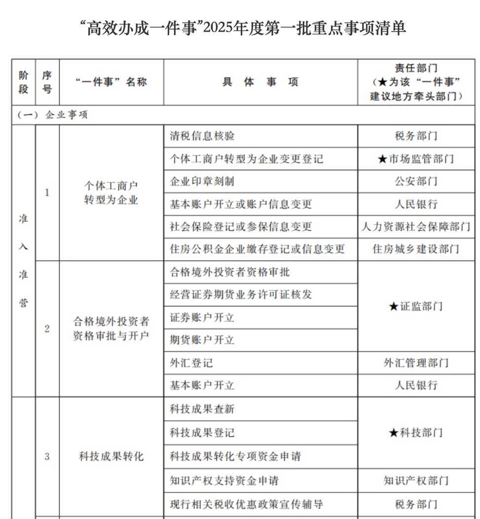 国务院办公厅发布了《“高效办成一件事”2025年度第一批重点事项清单》,涵盖企业和个人事务的高效办理措施,旨在优化政务服务,提升办事效率。