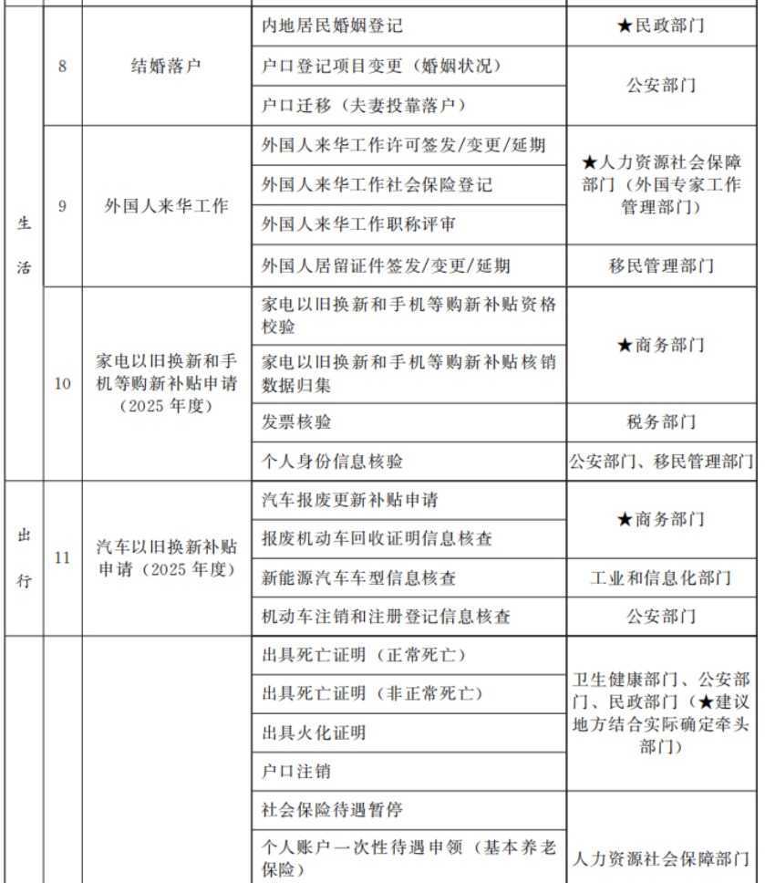 在个人事项方面,清单同样涵盖了多个与群众生活息息相关的方面,包括个人创业、结婚落户、外国人来华工作等,并特别提到了家电以旧换新和手机等购新补贴申请(2025年度)、汽车以旧换新补贴申请(2025年度)等具体政策,旨在进一步提升群众的生活质量和幸福感。此外,清单还关注到了个人身后事宜的处理,体现了政府对群众全生命周期服务的关注。