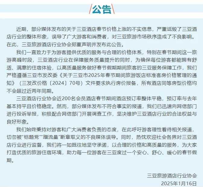2025年1月16日,三亚酒店行业协会通过其官方微信平台正式发布声明,坚决否认近期部分媒体关于三亚酒店春节期间价格大幅上涨的不实报道。协会指出,此类报道严重损害了三亚酒店行业的声誉,误导了公众及游客,对三亚旅游市场的正常秩序产生了不良影响。