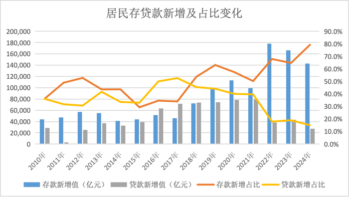 从历史数据对比来看,2024年住户存款新增额虽较2023年有所回落,但存款却更加集中于居民部门。央行数据显示,2024年居民新增存款占全部新增存款的比重接近80%,创下历史新高。这表明,当前居民的储蓄意愿极为强烈,且更倾向于选择定期和长期存款。