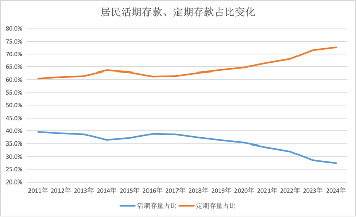 在新增存款占比快速提升的同时,居民存款也呈现出存长期、存定期的新特点。央行数据显示,2024年居民定期存款余额占居民存款余额的比重为72.7%,创历史新高。居民存款“定活比”由之前的“六四开”转为目前的“七三开”。此外,居民也倾向于存长期定期存款,以锁定更高的收益。