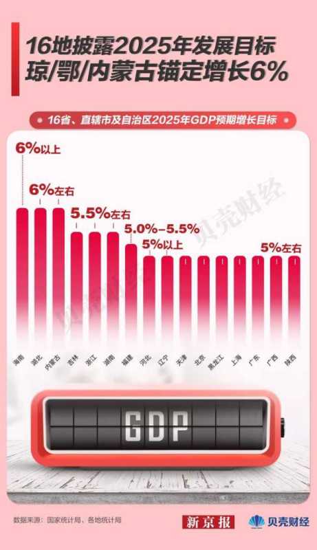 截至1月16日,全国16个省、直辖市及自治区已公布2025年经济增长目标,海南预期增长最高达6%以上,湖北、内蒙古锚定6%左右,其余省份目标在5.5%至5%之间。