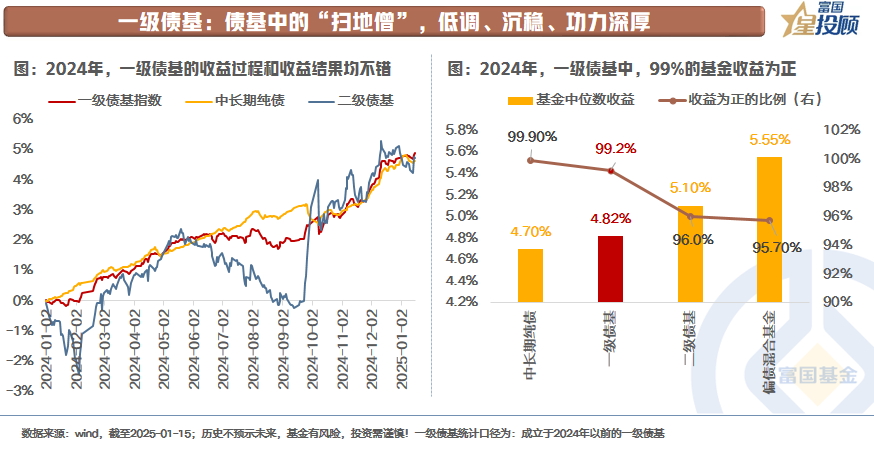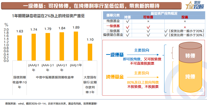 随着2025年的到来,纯债的静态收益率已降至低位。相较于纯债基金,一级债基因可投资可转债而具备更多灵活性。与可直接投资股票的二级债基和偏债混合基金相比,一级债基专注于可转债投资,其波动性相对较小,这为众多追求稳健回报的投资者带来了新的期待。
