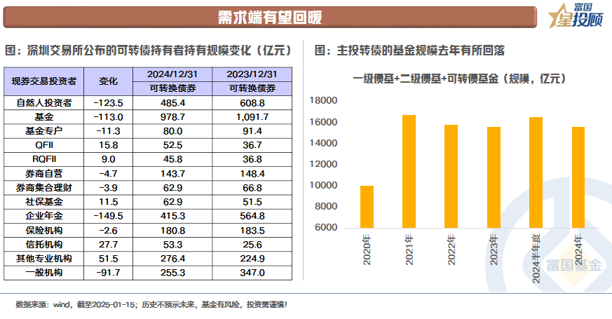 从深圳交易所公布的数据来看,可转债的持有规模中,基金、企业年金和自然人投资者的减持规模均超过百亿。这主要归因于两方面:个人投资者因小盘股流动性和信用风险冲击而离场,机构则主要因应对负债端赎回而减持。然而,进入2025年,这一局面有望改变。随着权益市场和可转债市场的回暖,含权债基的关注度迅速提升,相关产品规模的回升有望带动可转债配置需求的回升。同时,纯债收益率已降至低位,可转债成为众多债券投资者的新选择。